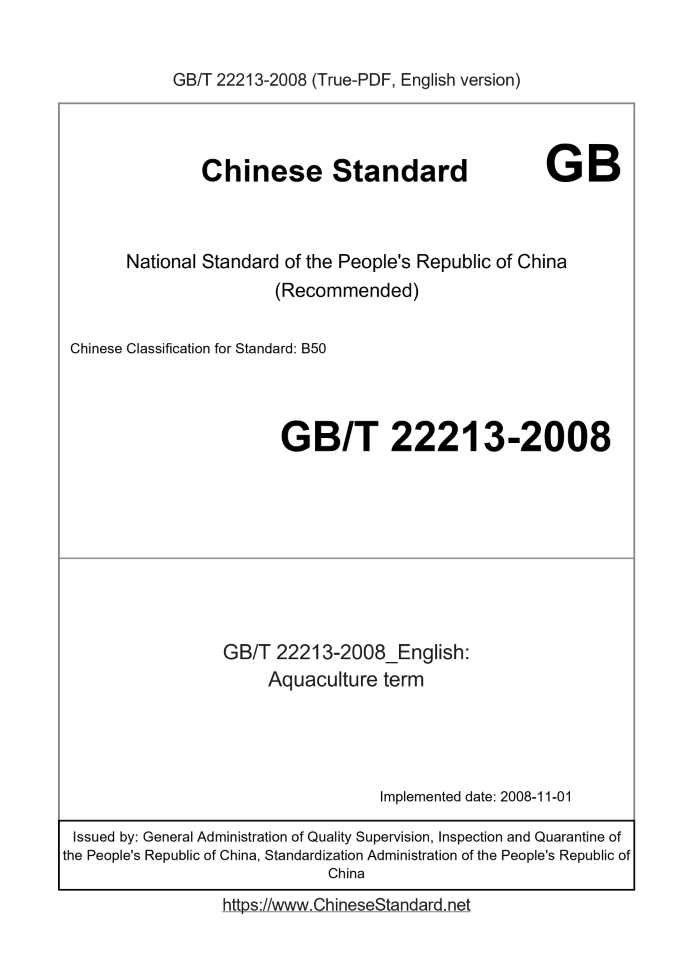 Delivery: <= 6 days. True-PDF full-copy in English will be manually translated and delivered via email. GB/T 22213-2008: Aquaculture term Status: Valid