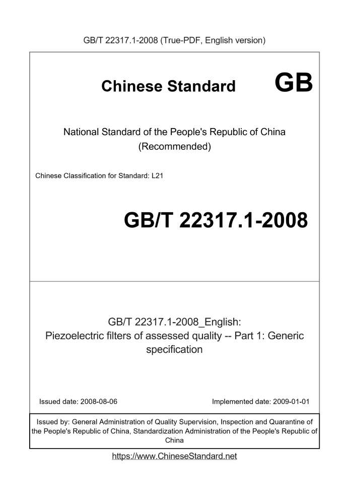 Delivery: <= 4 days. True-PDF full-copy in English will be manually translated and delivered via email. GB/T 22317.1-2008: Piezoelectric filters of assessed quality -- Part 1: Generic specification Status: Valid
