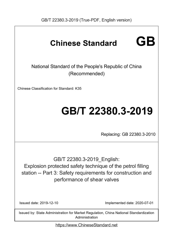 Delivery: <= 3 days. True-PDF full-copy in English will be manually translated and delivered via email. GB/T 22380.3-2019: Explosion protected safety technique of the petrol filling station -- Part 3: Safety requirements for construction and performance of shear valves Status: Valid GB/T 22380.3: Historical versions
