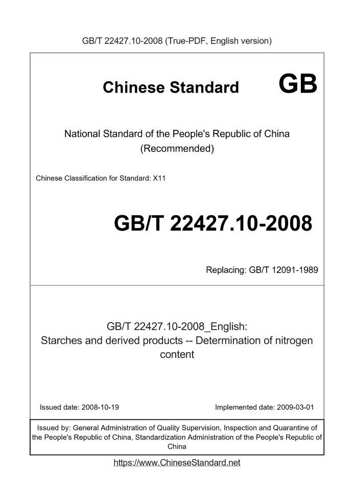 Delivery: <= 3 days. True-PDF full-copy in English will be manually translated and delivered via email. GB/T 22427.10-2008: Starches and derived products -- Determination of nitrogen content Status: Valid