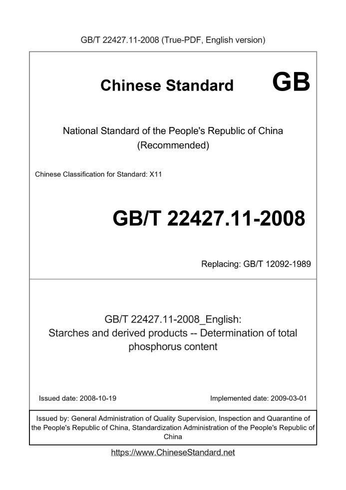 Delivery: <= 3 days. True-PDF full-copy in English will be manually translated and delivered via email. GB/T 22427.11-2008: Starches and derived products -- Determination of total phosphorus content Status: Obsolete