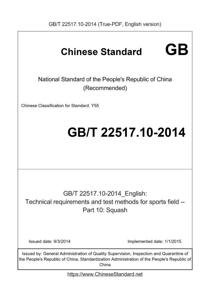 Delivery: <= 3 days. True-PDF full-copy in English will be manually translated and delivered via email. GB/T 22517.10-2014: Technical requirements and test methods for sports field -- Part 10: Squash Status: Valid