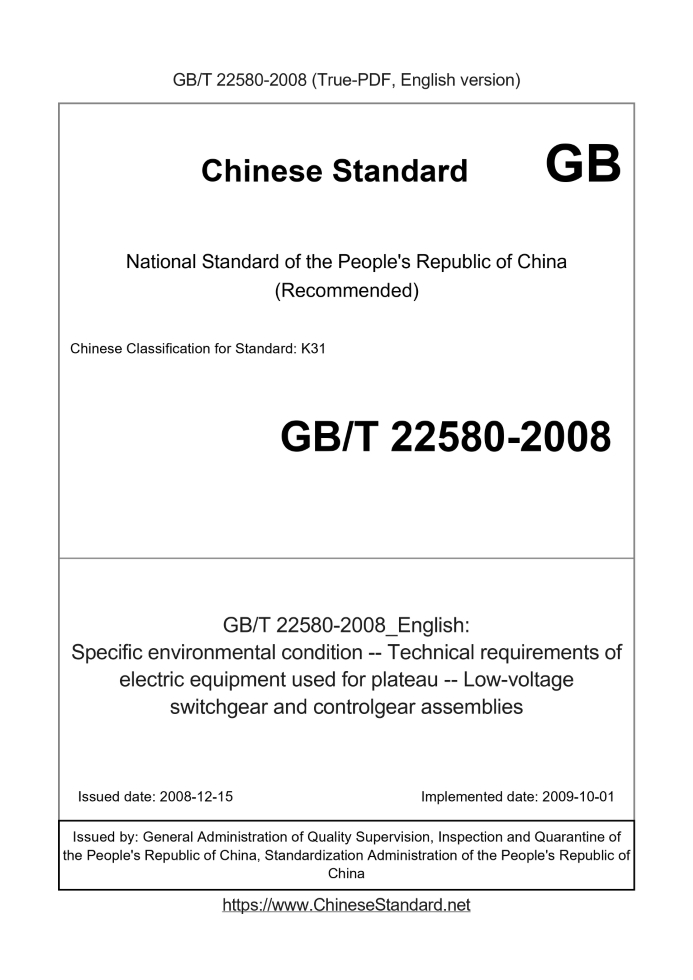 Delivery: <= 3 days. True-PDF full-copy in English will be manually translated and delivered via email. GB/T 22580-2008: Specific environmental condition -- Technical requirements of electric equipment used for plateau -- Low-voltage switchgear and controlgear assemblies Status: Valid