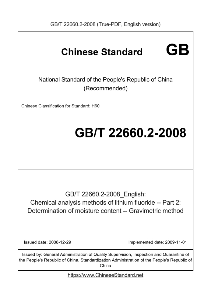 Delivery: <= 2 days. True-PDF full-copy in English will be manually translated and delivered via email. GB/T 22660.2-2008: Chemical analysis methods of lithium fluoride -- Part 2: Determination of moisture content -- Gravimetric method Status: Valid