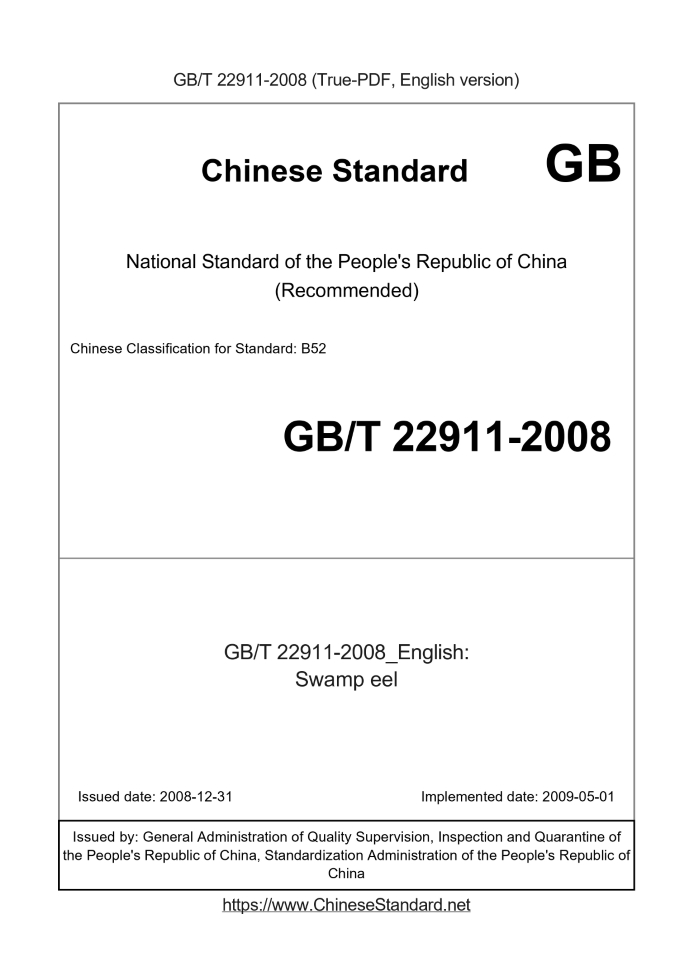 Delivery: <= 3 days. True-PDF full-copy in English will be manually translated and delivered via email. GB/T 22911-2008: Swamp eel Status: Valid