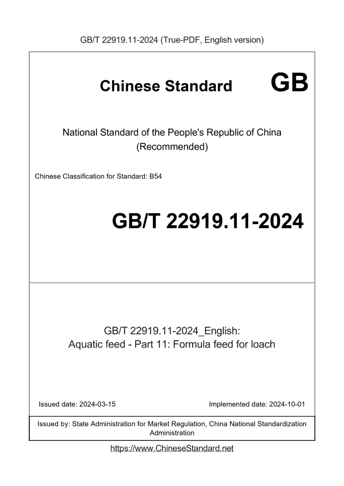 Delivery: <= 3 days. True-PDF full-copy in English will be manually translated and delivered via email. GB/T 22919.11-2024: Aquatic feed - Part 11: Formula feed for loach Status: Valid