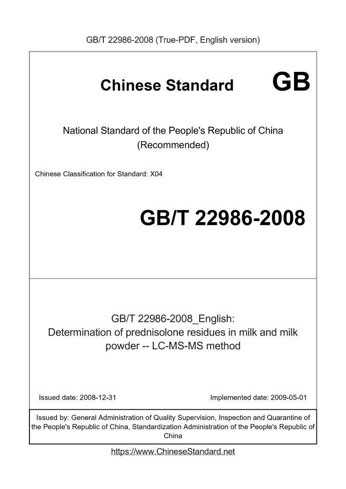 Delivery: <= 3 days. True-PDF full-copy in English will be manually translated and delivered via email. GB/T 22986-2008: Determination of prednisolone residues in milk and milk powder -- LC-MS-MS method Status: Valid