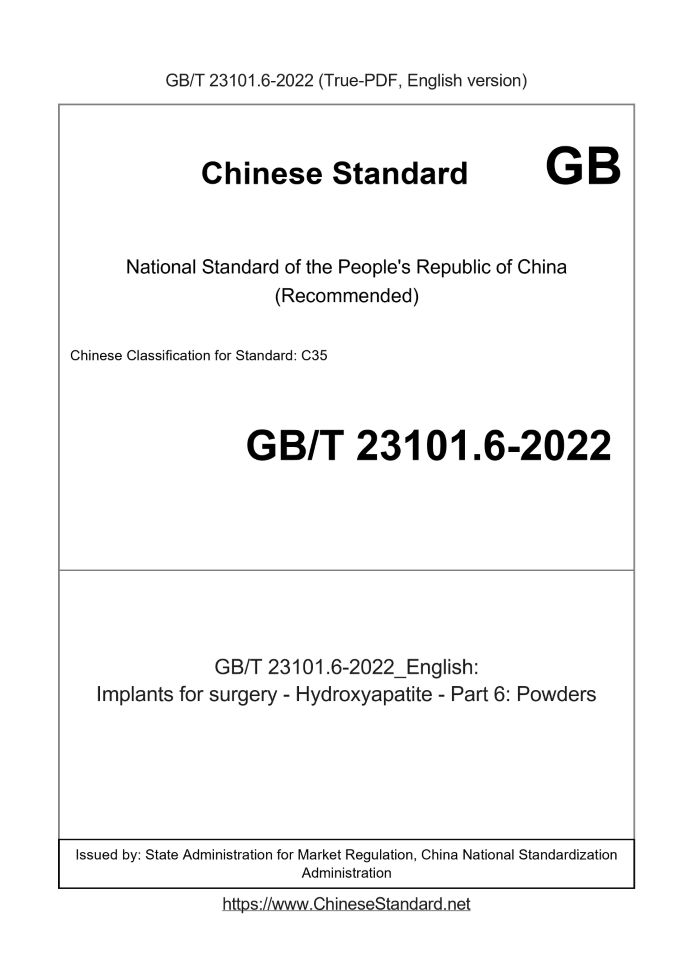 Delivery: <= 3 days. True-PDF full-copy in English will be manually translated and delivered via email. GB/T 23101.6-2022: Implants for surgery - Hydroxyapatite - Part 6: Powders Status: Valid