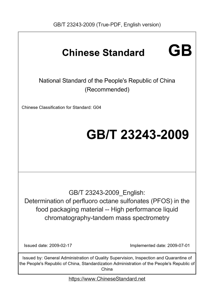 GB/T 23243-2009: Determination of perfluoro octane sulfonates (PFOS) in the food packaging material -- High performance liquid chromatography-tandem mass spectrometry