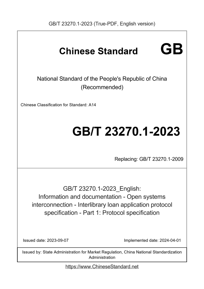 Basic dataStandard ID: GB/T 23270.1-2023 (GB/T23270.1-2023)Description (Translated English): Information and documentation - Open systems interconnection - Interlibrary loan application protocol specification - Part 1: Protocol specification Sector / Industry: National Standard (Recommended) Classification of Chinese Standard: A14 Classification of International Standard: 35.240.30 Word Count Estimation: 139,184 Date of Issue: 2023-09-07 Date of Implementation: 2024-04-01 Older Standard (superseded by this standard): GB/T 23270.1-2009 Issuing agency(ies): State Administration for Market Regulation, China National Standardization Administration GB/T 23270.1-2023: Information and documentation - Open systems interconnection - Interlibrary loan application protocol specification - Part 1: Protocol specification---This is a DRAFT version for illustration, not a final translation. Full copy of true-PDF in English version (including equations, symbols, images, flow-chart, tables, and figures etc.) will be manually/carefully translated upon your order. ICS 35.240.30 CCSA14 National Standards of People's Republic of China Replace GB/T 23270.1-2009 Information and document open system interconnection interlibrary loan Application Protocol Specification Part 1.Protocol Description (ISO 10161-1.2014,IDT) Published on 2023-09-07 2024-04-01 Implementation State Administration for Market Regulation Released by the National Standardization Administration Committee Table of contentsPreface V Introduction VI 1 Scope 1 2 Normative reference documents 1 3 Terms and Definitions 2 4 Abbreviations 19 5 Protocol Overview 19 5.1 Services provided19 5.2 Services that support settings 20 5.3 Model 20 6 Interlibrary Loan Application Protocol Data Unit 20 7 Transaction information 21 7.1 Transaction identifier 21 7.2 Protocol status 23 7.3 Protocol variables 24 7.4 Expiration timer 25 7.5 Requesting information 25 7.6 Historical information 26 8 process element 26 8.1 Events and Actions 26 8.2 Rules of Process for the Parties30 8.3 Procedural rules for intermediaries36 9 Abstract Grammar 40 9.1 ASN.1 Specification for Interlibrary Loan Application Protocol Data Unit 40 10 Consistency 67 10.1 Static consistency 67 10.2 Dynamic Consistency 68 10.3 Protocol Implementation Conformance Statement Requirements 68 Appendix A (Normative) Interlibrary Loan Status Table 70 A.1 Overview 70 A.2 Agreement 70 A.3 Actions taken under interlibrary loan agreements 71 A.4 Relationship with support services71 Appendix B (Normative) Transfer Syntax 101 B.1 Overview 101 B.2 Unsupported EDIFACT features 101 B.3 Character Set and Grammar Level 101 B.4 EDIFACT Exchange 101 B.5 Paragraph 102 B.6 Control section encoding 102 B.7 Encoding ILLAPDU 105 using EDIFACT Appendix C (Normative) Object identifiers and registration requirements specified in this document 125 C.1 Object identifier 125 specified in this document C.2 Registration Requirements125 Appendix D (normative) Registration procedure for interlibrary loan external data type definitions 126 D.1 Conditions for registering interlibrary loan external data types 126 D.2 Application scope and fields of interlibrary loan external data type definition 126 D.3 Reference forms for interlibrary loan external data types 126 D.4 Interlibrary loan external data type definition required content for registered entities 126 D.5 Recommended format for registered entities126 D.6 Procedure 126 taken from ISO /IEC 9834-1 D.7 Complete the procedure for registering interlibrary loan external data type definitions 127 D.8 Printing requirements for interlibrary loan external data type definitions 127 Appendix E (Informative) Example of Interlibrary Loan External Data Type Definition Registered Entity 128 Appendix F (Informative) Use of Support Services 129 F.1 Overview 129 F.2 “Store and forward” mapping 129 F.3 "Join Mode" Mapping 129 Appendix G (informative) Calling external document delivery service 131 Reference 132 Figure F.1 “Store and forward” mapping of interlibrary loan agreement 129 Figure F.2 “Join Mode” mapping of interlibrary loan agreement 130 Table 1 Interlibrary loan services19 Table 2 Composition of simple transaction identifier 22 Table 3 Transaction identifier composition for links or partitions 22 Table A.1 Input event list 71 Table A.2 Output event list 73 Table A.3 Predicate 75 Table A.4 Requester status table---processing stage 75 Table A.5 Requester status table---Tracking phase (Part 1) 79 Table A.6 Requester status table---Tracking phase (Part 2) 81 Table A.7 Responder status table---processing stage 84 Table A.8 Responder status table---Tracking phase 87 Table A.9 Mediation status table---Requester role 90 Table A.10 Intermediary status table---responder role 94 Table B.1 Mapping ASN.1 data types and corresponding message identifier values 105ForewordThis document complies with the provisions of GB/T 1.1-2020 "Standardization Work Guidelines Part 1.Structure and Drafting Rules of Standardization Documents" Drafting. This document is Part 1 of GB/T 23270 "Interlibrary Loan Application Protocol Specification for the Interconnection of Information and Document Open Systems". GB/T 23270 has published the following parts. ---Part 1.Agreement Statement; ---Part 2.Protocol Implementation Conformance Statement (PICS) provisions. This document replaces GB/T 23270.1-2009 "Information and Document Open System Interconnection Interlibrary Loan Application Protocol Specification Part 1" "Protocol Specification", compared with GB/T 23270.1-2009, in addition to structural adjustments and editorial changes, the main technical changes are as follows. a) Deleted the descriptions related to GB/T 19688.1 in terms and definitions (see 3.6, 3.6.1, 3.6.19, 3.6.21,.2009 edition 3.6.82, 3.6.89, 3.6.105, 3.6.154); b) Added events in the process element related to service primitive requests from interlibrary loan customers (see 8.1.1); c) Changed the ISBN string length in the structured type th