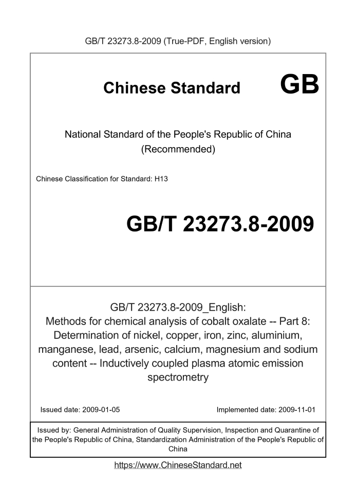 Delivery: <= 3 days. True-PDF full-copy in English will be manually translated and delivered via email. GB/T 23273.8-2009: Methods for chemical analysis of cobalt oxalate -- Part 8: Determination of nickel, copper, iron, zinc, aluminium, manganese, lead, arsenic, calcium, magnesium and sodium content -- Inductively coupled plasma atomic emission spectrometry Status: Valid