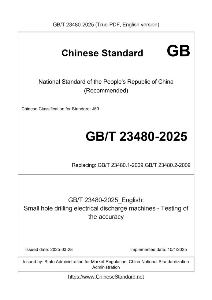 Delivery: <= 5 days. True-PDF full-copy in English will be manually translated and delivered via email. GB/T 23480-2025: Small hole drilling electrical discharge machines - Testing of the accuracy Status: Valid GB/T 23480: Historical versions