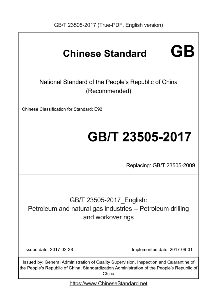 Delivery: <= 3 days. True-PDF full-copy in English will be manually translated and delivered via email. GB/T 23505-2017: Petroleum and natural gas industries -- Petroleum drilling and workover rigs Status: Valid GB/T 23505: Historical versions