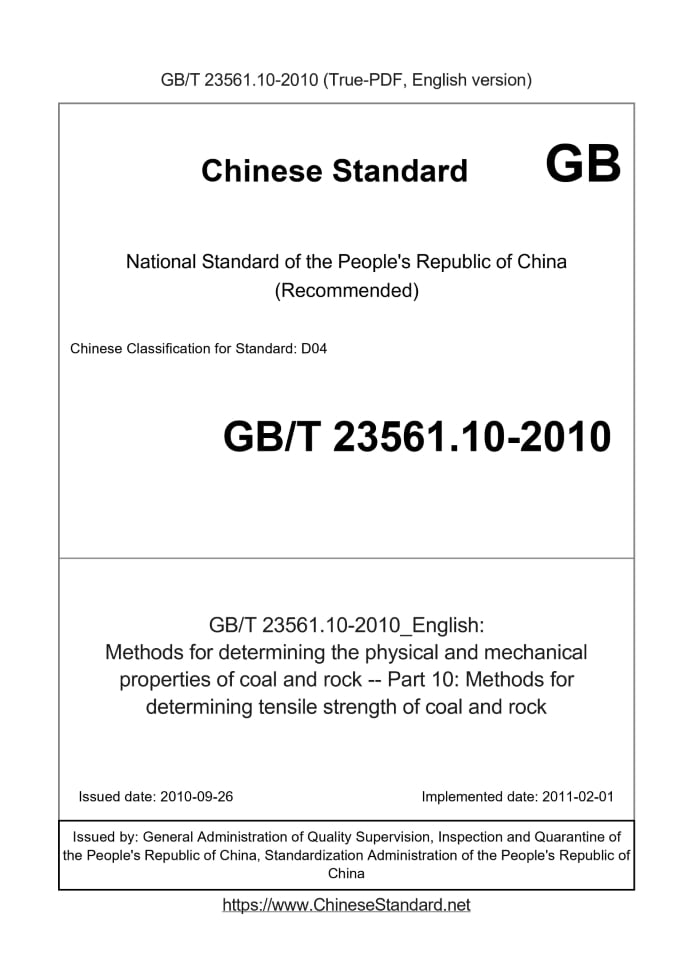 GB/T 23561 "Determination of physical and mechanical properties of coal and rock" press release section is divided into 16 parts. --- Part 1. Sampling general provisions; --- Part 2. Determination of true density of coal and rock method; --- Part 3. coal and rock bulk density determination; --- Part 4. coal and rock porosity calculation method; --- Part 5. Determination of water absorption of coal and rock; --- Part 6. Methods for determination of moisture content of coal and rock; --- Part 7. Determination of uniaxial compressive strength and softening coefficient calculation method; --- Part 8. coal and rock deformation parameter determination method; --- Part 9. Coal and triaxial strength and deformation parameters determination method; --- Part 10. Determination of tensile strength of coal and rock; --- Part 11. coal and rock shear strength measurement method; --- Part 12. Coal consistent coefficient of determination; --- Part 13. coal and rock point load strength index measuring method; --- Part 14. Determination of swelling rock; --- Part 15. Determination of rock swelling stress; --- Part 16. Determination of rock resistant to disintegration index method. This part of GB /Part of 10 T 23561. This section of Appendix A normative appendix. This section is proposed and managed by the China Coal Industry Association. This section is drafted. Coal Mining Research Institute Research Branch Design and Research Institute of Coal Research Branch detection. The main drafters of this section. Qi Qingxin, Li Jiqing, Maode Bing, Fu Jingyu. Physical and mechanical properties of coal and rock Determination Part 10. Determination of tensile strength of coal and rock