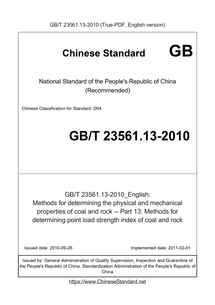 Delivery: <= 3 days. True-PDF full-copy in English will be manually translated and delivered via email. GB/T 23561.13-2010: Methods for determining the physical and mechanical properties of coal and rock -- Part 13: Methods for determining point load strength index of coal and rock Status: Valid