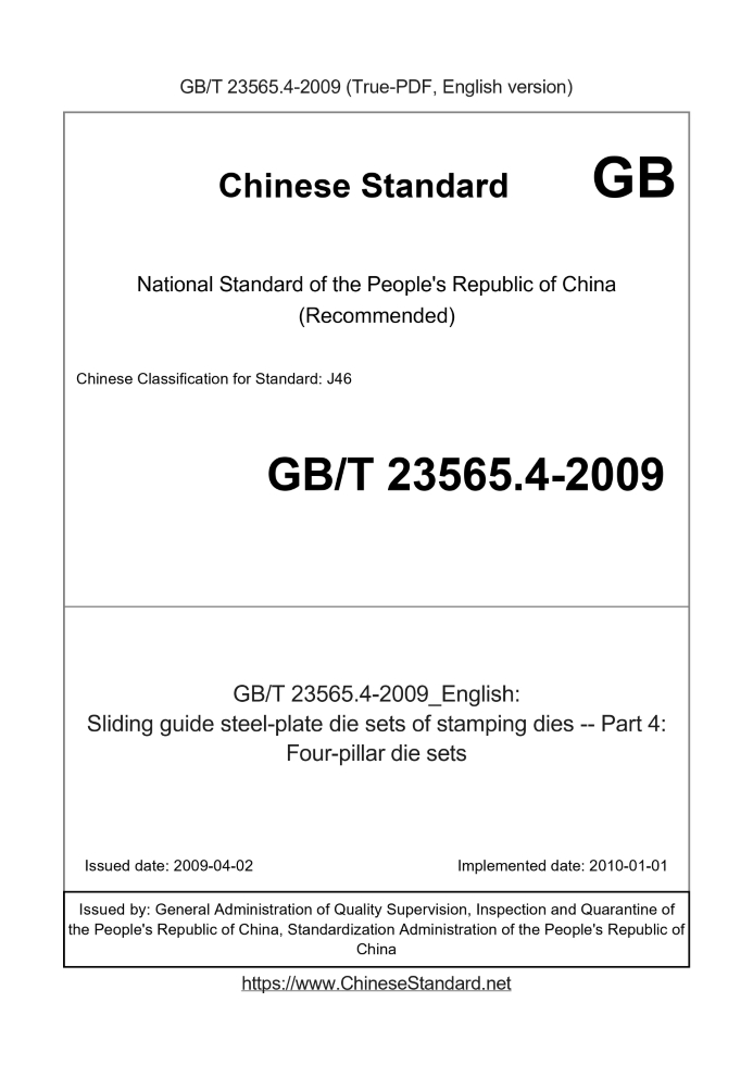 Delivery: <= 3 days. True-PDF full-copy in English will be manually translated and delivered via email. GB/T 23565.4-2009: Sliding guide steel-plate die sets of stamping dies -- Part 4: Four-pillar die sets Status: Valid