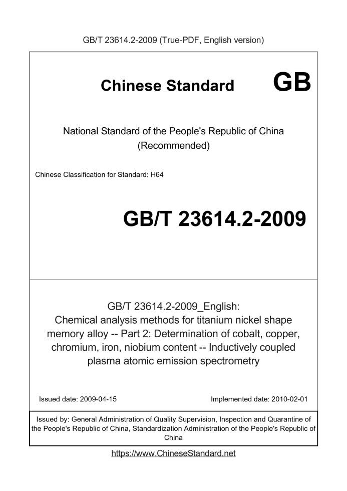 Delivery: <= 3 days. True-PDF full-copy in English will be manually translated and delivered via email. GB/T 23614.2-2009: Chemical analysis methods for titanium nickel shape memory alloy -- Part 2: Determination of cobalt, copper, chromium, iron, niobium content -- Inductively coupled plasma atomic emission spectrometry Status: Valid