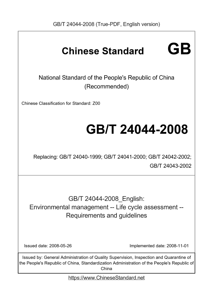 Delivery: <= 4 days. True-PDF full-copy in English will be manually translated and delivered via email. GB/T 24044-2008: Environmental management -- Life cycle assessment -- Requirements and guidelines Status: Valid