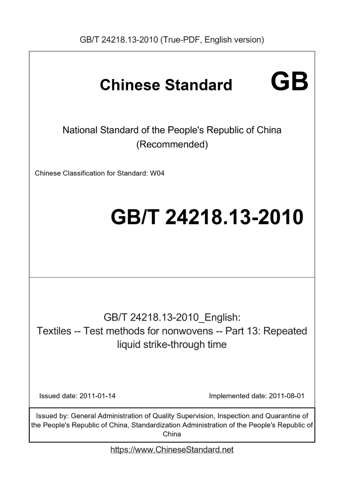 Delivery: <= 3 days. True-PDF full-copy in English will be manually translated and delivered via email. GB/T 24218.13-2010: Textiles -- Test methods for nonwovens -- Part 13: Repeated liquid strike-through time Status: Valid