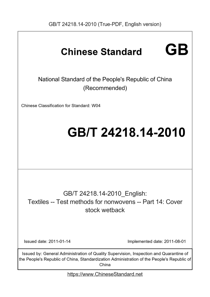 Delivery: <= 3 days. True-PDF full-copy in English will be manually translated and delivered via email. GB/T 24218.14-2010: Textiles -- Test methods for nonwovens -- Part 14: Cover stock wetback Status: Valid