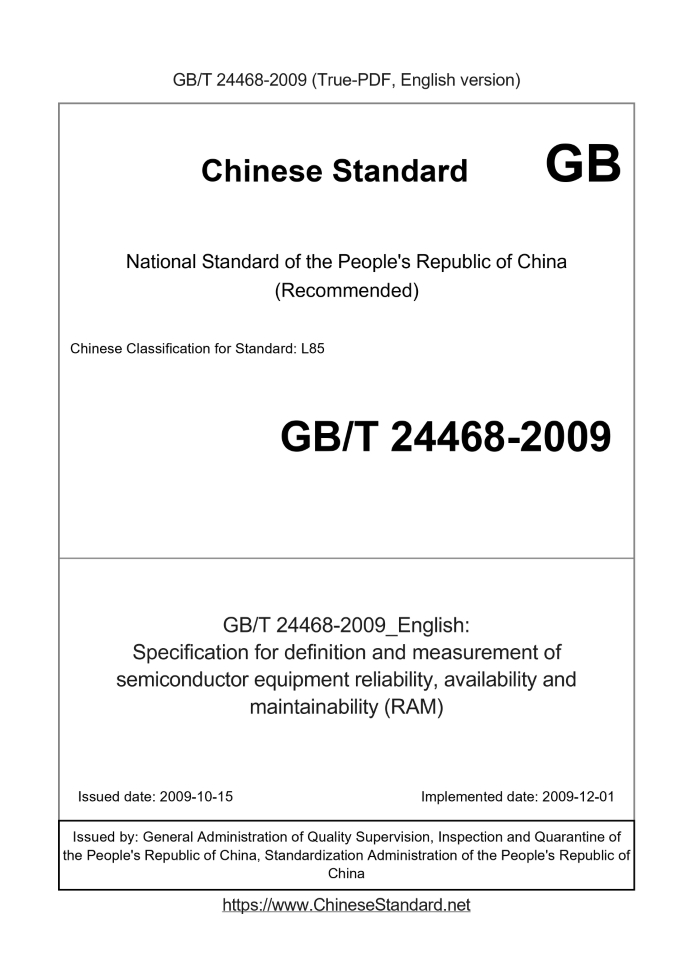 Specification for definition and measurement of semiconductor equipment reliability, availability and maintainability (RAM) ICS 17.040.30 L85 National Standards of People's Republic of China Semiconductor equipment reliability, availability and maintainability (RAM) of the definition and measurement specifications Posted 2009-10-15 2009-12-01 implementation Administration of Quality Supervision, Inspection and Quarantine of People's Republic of China Standardization Administration of China released