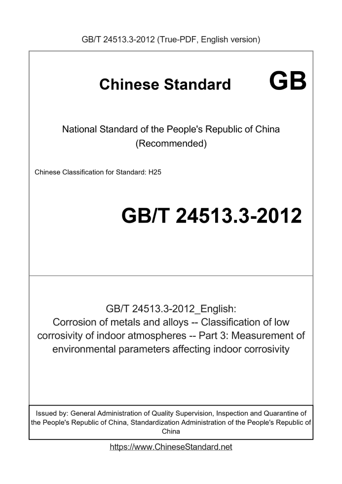 Delivery: <= 3 days. True-PDF full-copy in English will be manually translated and delivered via email. GB/T 24513.3-2012: Corrosion of metals and alloys -- Classification of low corrosivity of indoor atmospheres -- Part 3: Measurement of environmental parameters affecting indoor corrosivity Status: Valid