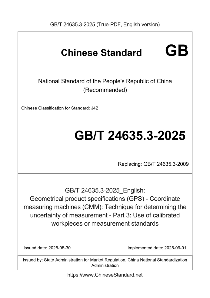 Delivery: <= 3 days. True-PDF full-copy in English will be manually translated and delivered via email. GB/T 24635.3-2025: Geometrical product specifications (GPS) - Coordinate measuring machines (CMM): Technique for determining the uncertainty of measurement - Part 3: Use of calibrated workpieces or measurement standards Status: Valid GB/T 24635.3: Historical versions