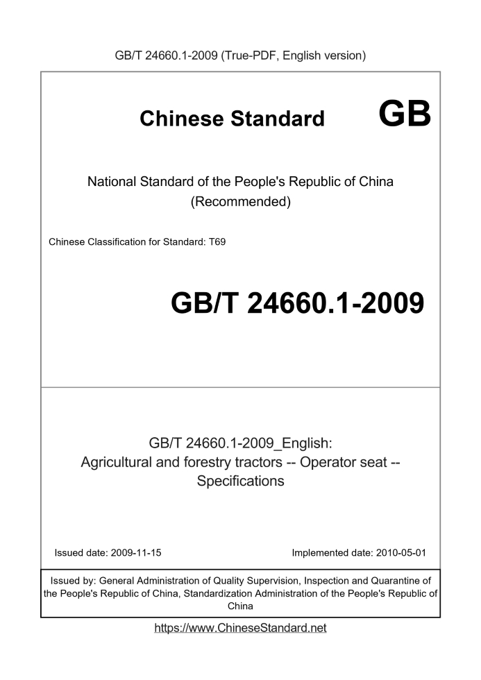 Delivery: <= 3 days. True-PDF full-copy in English will be manually translated and delivered via email. GB/T 24660.1-2009: Agricultural and forestry tractors -- Operator seat -- Specifications Status: Valid