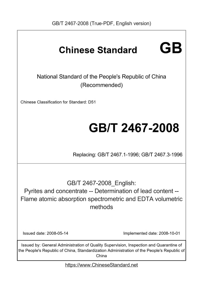 Delivery: <= 3 days. True-PDF full-copy in English will be manually translated and delivered via email. GB/T 2467-2008: Pyrites and concentrate -- Determination of lead content -- Flame atomic absorption spectrometric and EDTA volumetric methods Status: Valid GB/T 2467: Historical versions