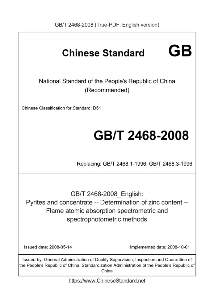 Delivery: <= 3 days. True-PDF full-copy in English will be manually translated and delivered via email. GB/T 2468-2008: Pyrites and concentrate -- Determination of zinc content -- Flame atomic absorption spectrometric and spectrophotometric methods Status: Valid GB/T 2468: Historical versions