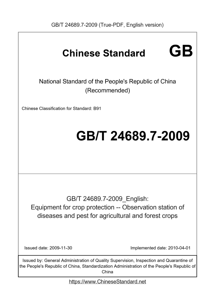 Delivery: <= 3 days. True-PDF full-copy in English will be manually translated and delivered via email. GB/T 24689.7-2009: Equipment for crop protection -- Observation station of diseases and pest for agricultural and forest crops Status: Valid