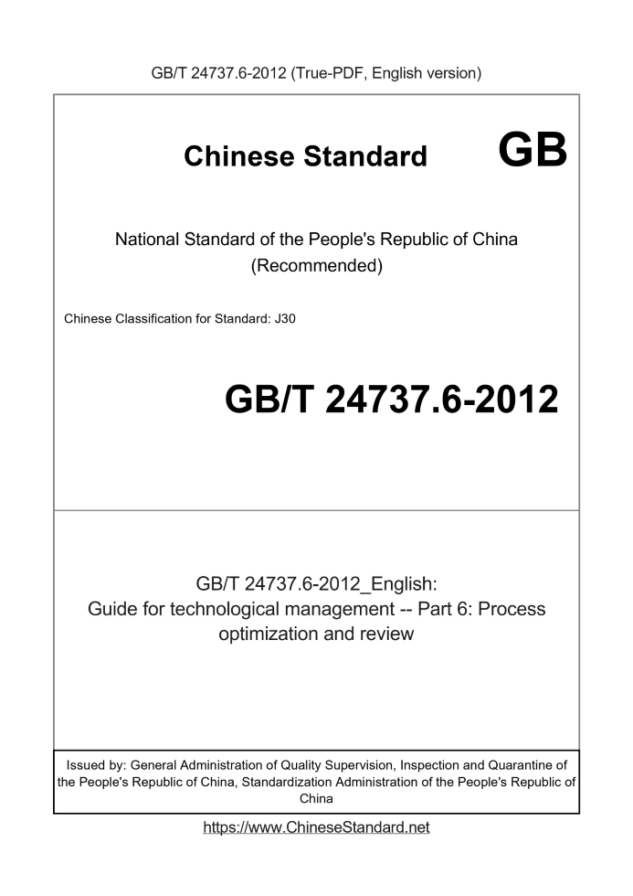 Delivery: <= 4 days. True-PDF full-copy in English will be manually translated and delivered via email. GB/T 24737.6-2012: Guide for technological management -- Part 6: Process optimization and review Status: Valid