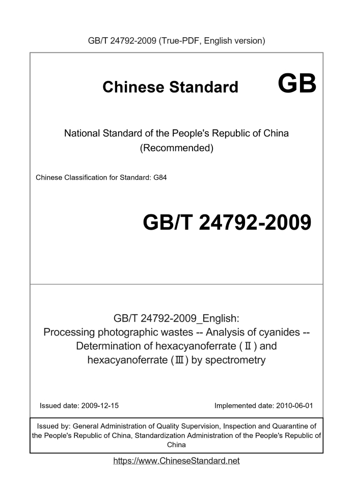 Delivery: <= 3 days. True-PDF full-copy in English will be manually translated and delivered via email. GB/T 24792-2009: Processing photographic wastes -- Analysis of cyanides -- Determination of hexacyanoferrate (Ⅱ) and hexacyanoferrate (Ⅲ) by spectrometry Status: Valid
