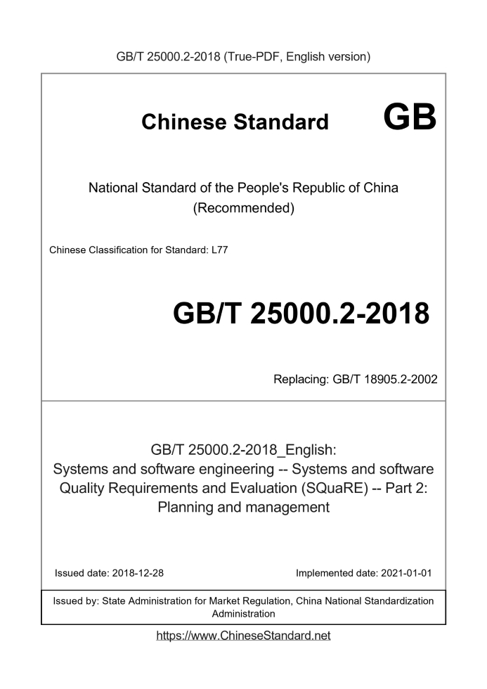 Delivery: <= 4 days. True-PDF full-copy in English will be manually translated and delivered via email. GB/T 25000.2-2018: Systems and software engineering -- Systems and software Quality Requirements and Evaluation (SQuaRE) -- Part 2: Planning and management Status: Valid