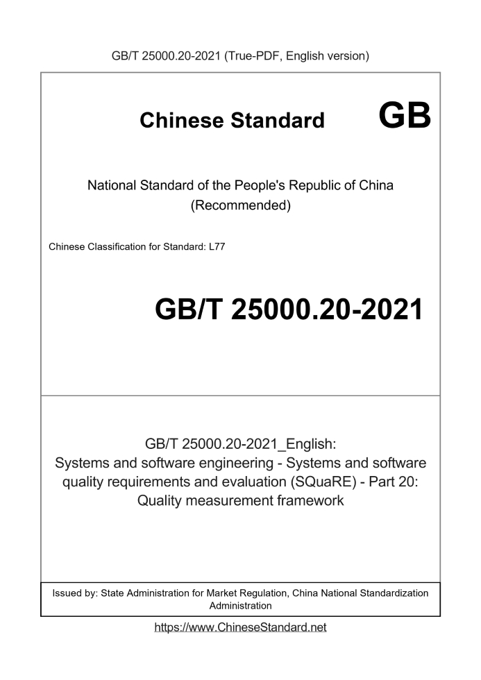 Delivery: <= 5 days. True-PDF full-copy in English will be manually translated and delivered via email. GB/T 25000.20-2021: Systems and software engineering - Systems and software quality requirements and evaluation (SQuaRE) - Part 20: Quality measurement framework Status: Valid