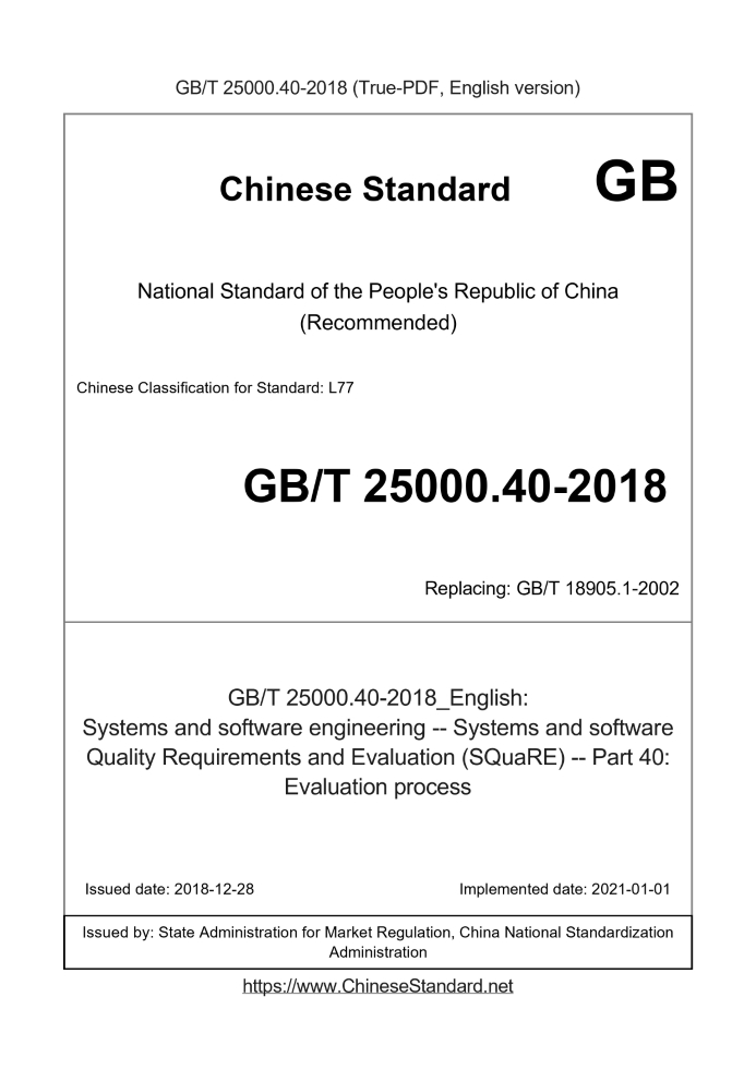 Delivery: <= 7 days. True-PDF full-copy in English will be manually translated and delivered via email. GB/T 25000.40-2018: Systems and software engineering -- Systems and software Quality Requirements and Evaluation (SQuaRE) -- Part 40: Evaluation process Status: Valid
