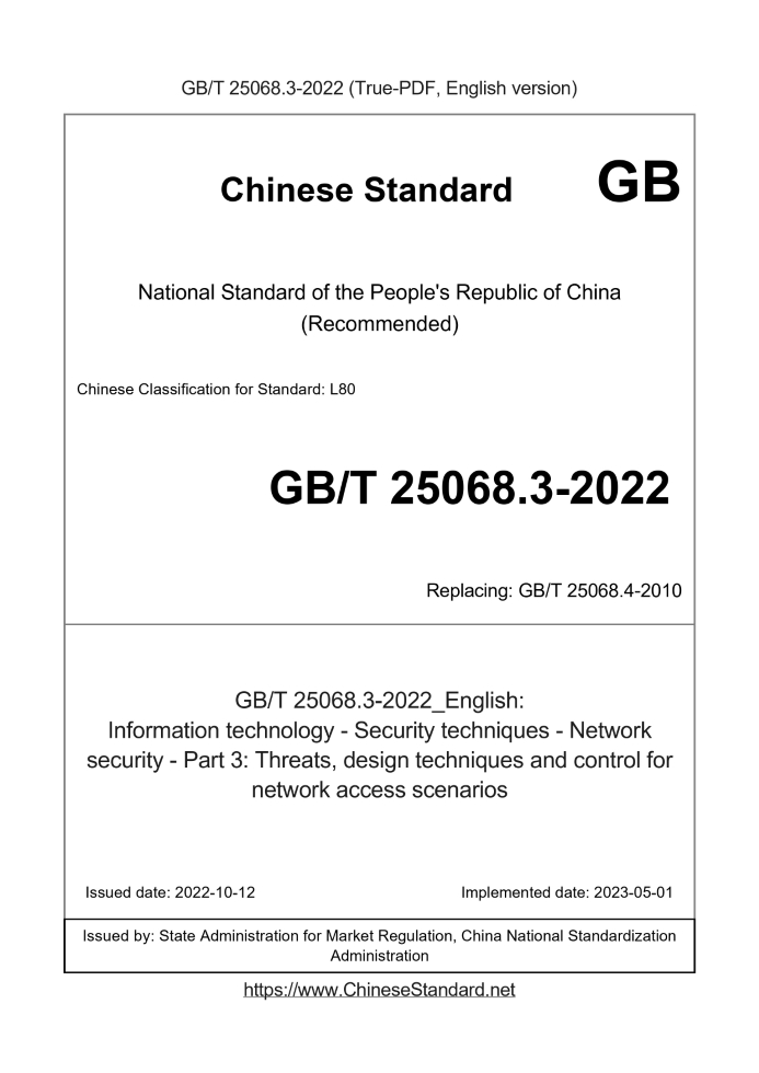 Delivery: <= 6 days. True-PDF full-copy in English will be manually translated and delivered via email. GB/T 25068.3-2022: Information technology - Security techniques - Network security - Part 3: Threats, design techniques and control for network access scenarios Status: Valid GB/T 25068.3: Historical versions