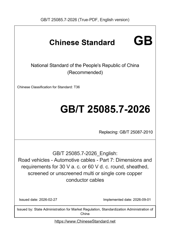US$534.00 · In stock · Download in 9 secondsGB/T 25085.7-2026: Road vehicles - Automotive cables - Part 7: Dimensions and requirements for 30 V a. c. or 60 V d. c. round, sheathed, screened or unscreened multi or single core copper conductor cables