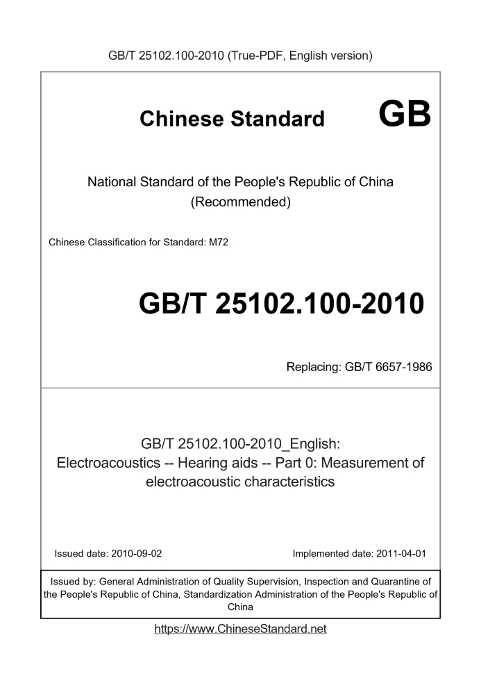 Delivery: <= 3 days. True-PDF full-copy in English will be manually translated and delivered via email. GB/T 25102.100-2010: Electroacoustics -- Hearing aids -- Part 0: Measurement of electroacoustic characteristics Status: Valid