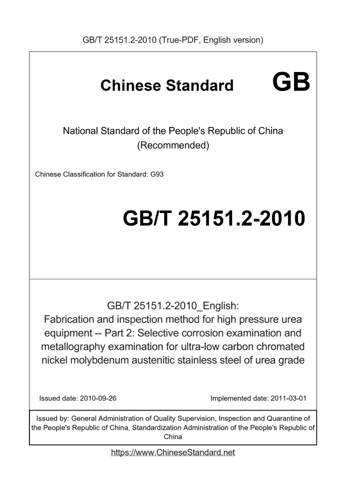 Delivery: <= 3 days. True-PDF full-copy in English will be manually translated and delivered via email. GB/T 25151.2-2010: Fabrication and inspection method for high pressure urea equipment -- Part 2: Selective corrosion examination and metallography examination for ultra-low carbon chromated nickel molybdenum austenitic stainless steel of urea grade Status: Valid