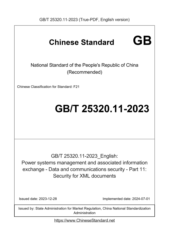 Delivery: <= 6 days. True-PDF full-copy in English will be manually translated and delivered via email. GB/T 25320.11-2023: Power systems management and associated information exchange - Data and communications security - Part 11: Security for XML documents Status: Valid