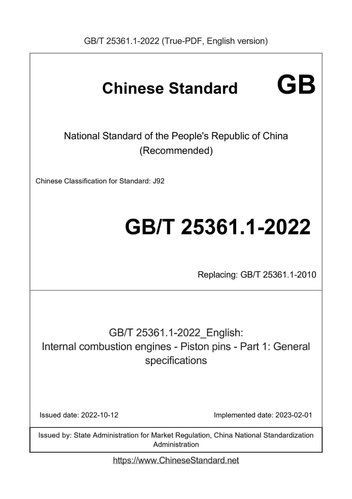 Delivery: <= 5 days. True-PDF full-copy in English will be manually translated and delivered via email. GB/T 25361.1-2022: Internal combustion engines - Piston pins - Part 1: General specifications Status: Valid GB/T 25361.1: Historical versions