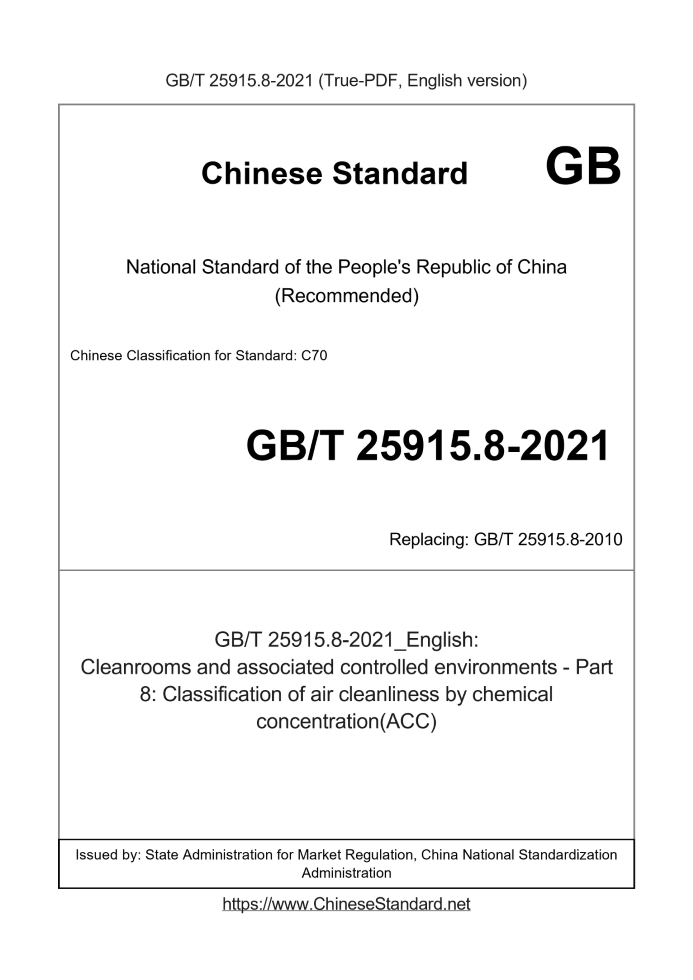 Delivery: <= 5 days. True-PDF full-copy in English will be manually translated and delivered via email. GB/T 25915.8-2021: Cleanrooms and associated controlled environments - Part 8: Classification of air cleanliness by chemical concentration(ACC) Status: Valid GB/T 25915.8: Historical versions