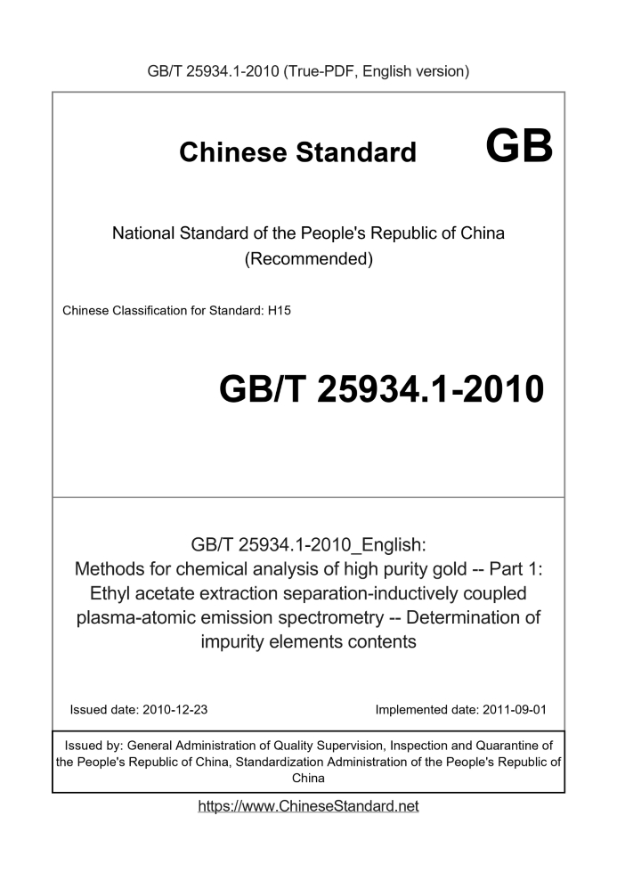Delivery: <= 1 days. True-PDF full-copy in English will be manually translated and delivered via email. GB/T 25934.1-2010: Methods for chemical analysis of high purity gold -- Part 1: Ethyl acetate extraction separation-inductively coupled plasma-atomic emission spectrometry -- Determination of impurity elements contents Status: Valid