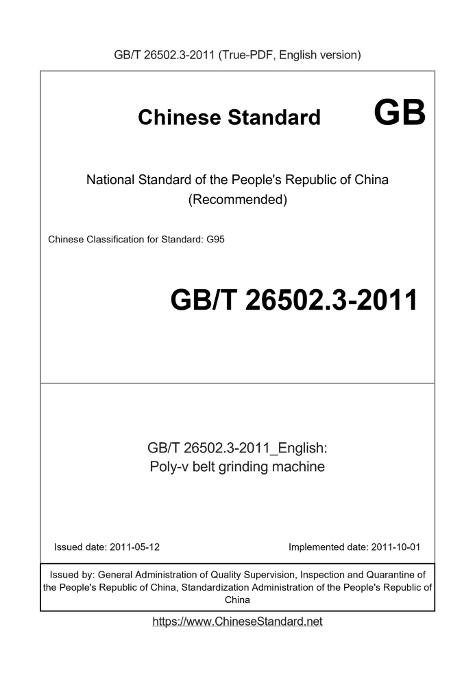 Delivery: <= 3 days. True-PDF full-copy in English will be manually translated and delivered via email. GB/T 26502.3-2011: Poly-v belt grinding machine Status: Valid