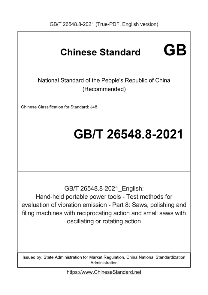 GB/T 26548.8-2021: Hand-held portable power tools - Test methods for evaluation of vibration emission - Part 8: Saws, polishing and filing machines with reciprocating action and small saws with oscillating or rotating action