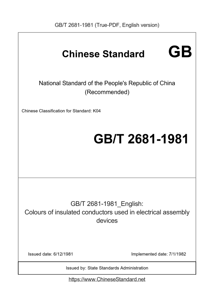 Delivery: <= 2 days. True-PDF full-copy in English will be manually translated and delivered via email. GB/T 2681-1981: Colours of insulated conductors used in electrical assembly devices Status: Obsolete