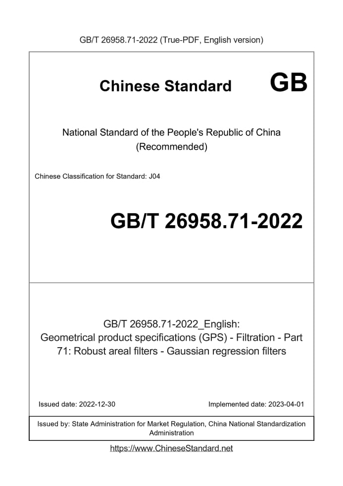 Delivery: <= 4 days. True-PDF full-copy in English will be manually translated and delivered via email. GB/T 26958.71-2022: Geometrical product specifications (GPS) - Filtration - Part 71: Robust areal filters - Gaussian regression filters Status: Valid