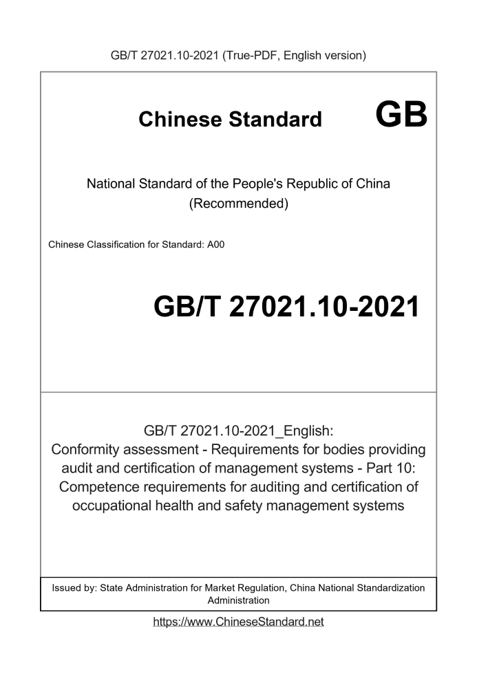Delivery: <= 3 days. True-PDF full-copy in English will be manually translated and delivered via email. GB/T 27021.10-2021: Conformity assessment - Requirements for bodies providing audit and certification of management systems - Part 10: Competence requirements for auditing and certification of occupational health and safety management systems Status: Valid