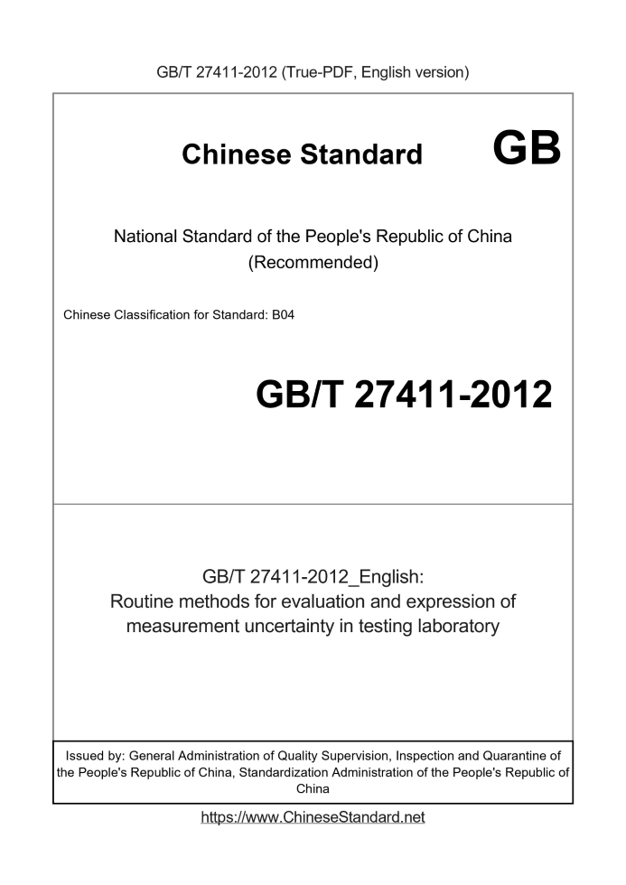Delivery: <= 6 days. True-PDF full-copy in English will be manually translated and delivered via email. GB/T 27411-2012: Routine methods for evaluation and expression of measurement uncertainty in testing laboratory Status: Valid